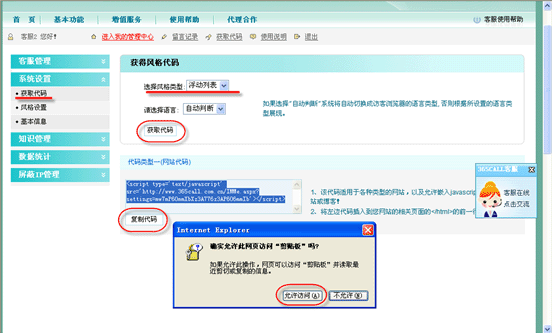 點擊“獲取代碼”按鈕,得到代碼,點擊“復制代碼”,選“允許訪問”,就把獲取的代碼復制好了,這時只要再粘貼“到網站的相關頁面的 </html> 的前一行”即可。