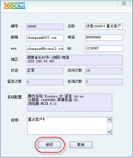 這時,彈出訪客信息編輯窗口,輸入相應的需要標注的資料信息,點擊“修改”按鈕: