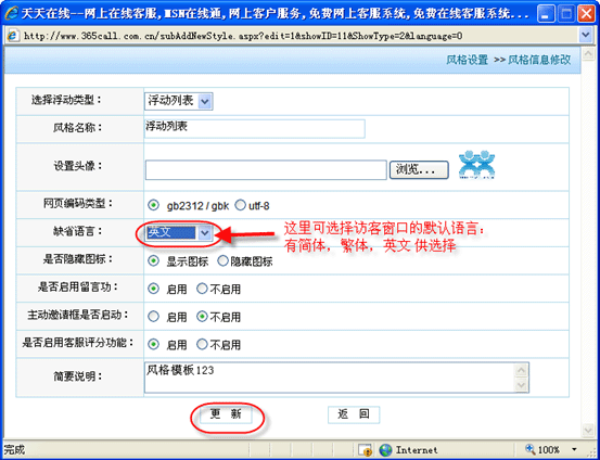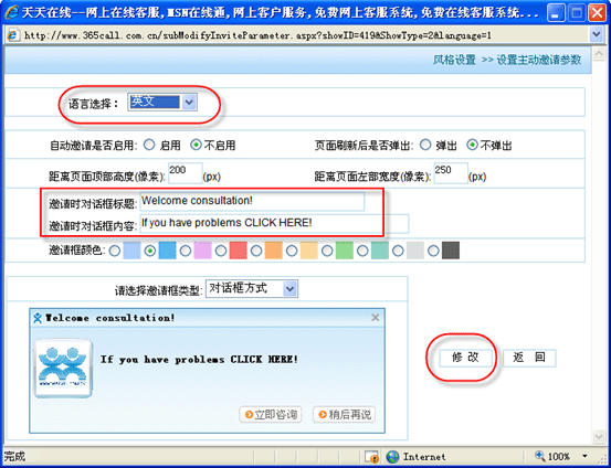| 再次點擊“系統(tǒng)設(shè)置”->“風(fēng)格設(shè)置”->“主動邀請設(shè)置”,彈出主動邀請設(shè)置頁,在“語言選擇”選擇要設(shè)置的語言種類,輸入完畢信息后,點擊“修改”按鈕: |
