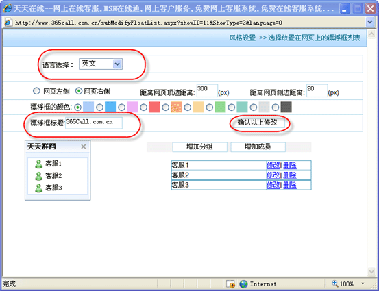 然后點擊“系統(tǒng)設(shè)置”->“風(fēng)格設(shè)置”->“客服圖標(biāo)設(shè)置”,彈出客服圖標(biāo)設(shè)置頁,“語言選擇”欄選擇需要設(shè)置的語言,“漂浮框標(biāo)題”欄輸入需要設(shè)置的該語言的標(biāo)題,然后點擊“確認(rèn)以上修改”: |