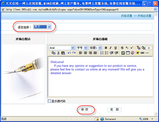 | 再次點擊“系統(tǒng)設(shè)置”->“風(fēng)格設(shè)置”->“開場白設(shè)置”,彈出開場白設(shè)置頁,在“語言選擇”選擇要設(shè)置的語言種類,輸入完畢信息后,點擊“修改”按鈕: |