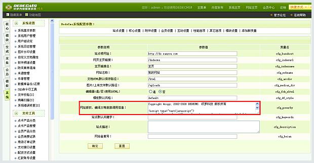 首先獲取在線客服安裝代碼,然后登陸DeDecms后臺,進入系統》系統基本參數,復制在線客服